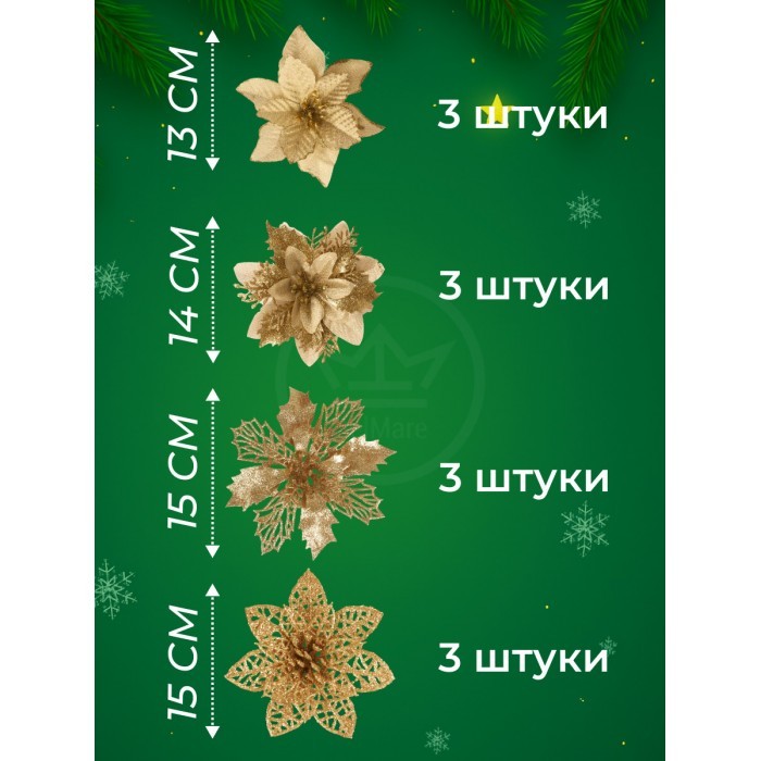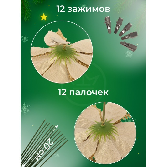 Набор Цветы Пуансеттия (12 штук - 13/14/15 см + проволока+зажимы) золото 266218