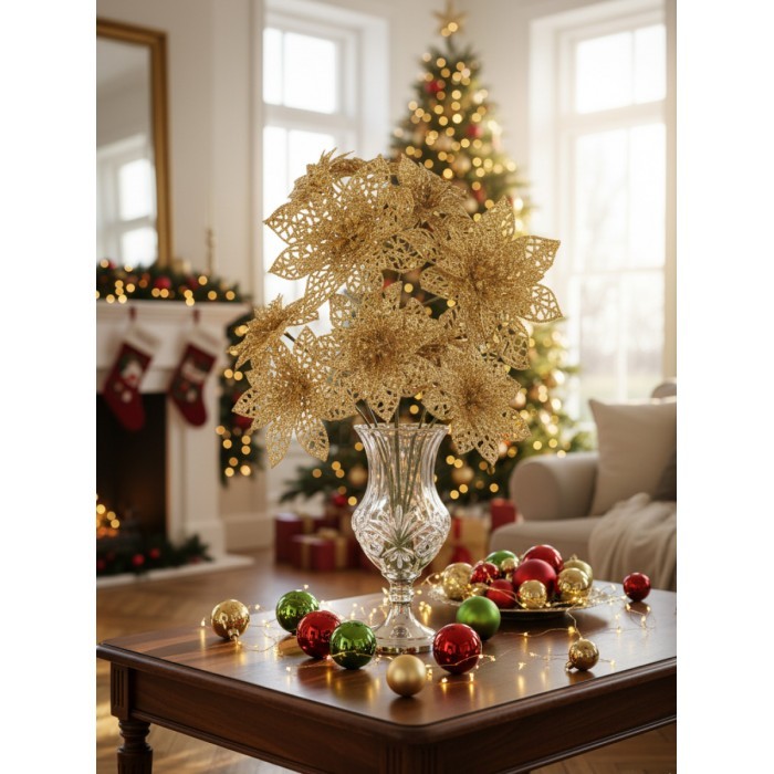 Набор Цветы Пуансеттия (15 штук - 8см-5шт/10см-5шт/14см--5шт+зажимы 15шт) золото 266224